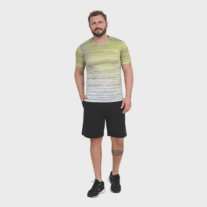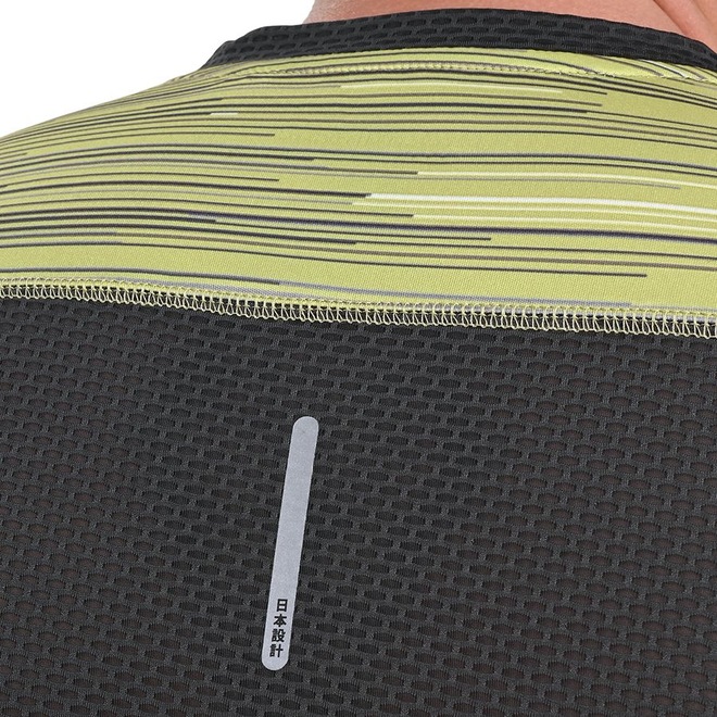 Camiseta feita com dois tipos de tecidos, frente com estampa exclusiva e costas em mesh, que proporcionam conforto e respirabilidade durante a corrida. Possui gola interrompida, bolso traseiro e abertura lateral. As costuras em flatlock que diminuem o atrito com o corpo. Logos refletivos.