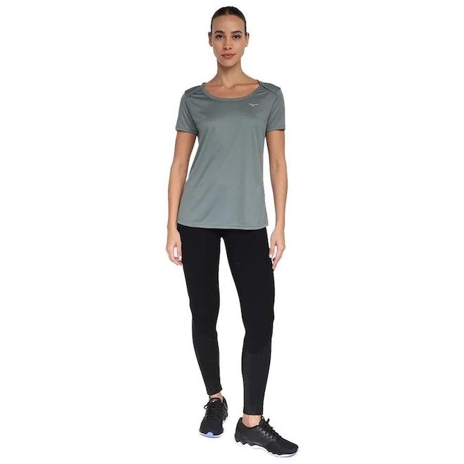 A camiseta Mizuno Feminina é de gola careca, com detalhes refletivos que facilitam a visibilidade em locais com pouca iluminação.