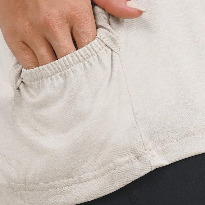 Camiseta em malha de poliéster com elastano mescla, cava raglan e bolso traseiro. Costuras flatlock nas cavas, laterais e recortes dos ombros. Logo refletivo e estampa frontal em relevo.