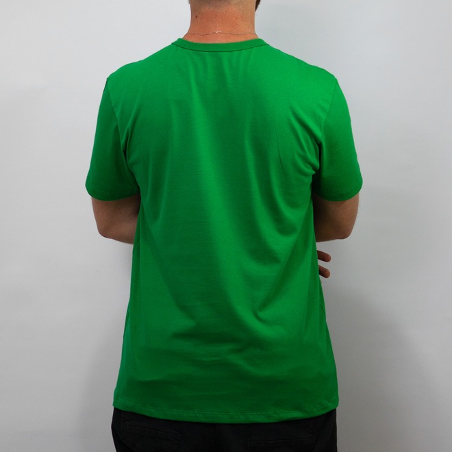 Com sua cor predominante em verde vibrante, ela traz na parte frontal uma composição de diversos símbolos menores aplicados com efeito gel, criando uma textura única que destaca a identidade do time. As costas são lisas, sem detalhes, mantendo o foco na performance e no conforto durante o jogo.