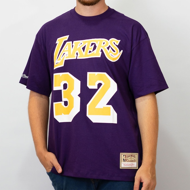 Na parte frontal, exibe em destaque a palavra “LAKERS” em seguida pelo número “32” logo abaixo — uma referência ao icônico jogador Magic Johnson. No canto inferior direito, há um patch com os dizeres “Hardwood Classics” e “Mitchell & Ness”, indicando que se trata de uma edição vintage, celebrando os clássicos da NBA.