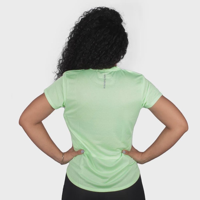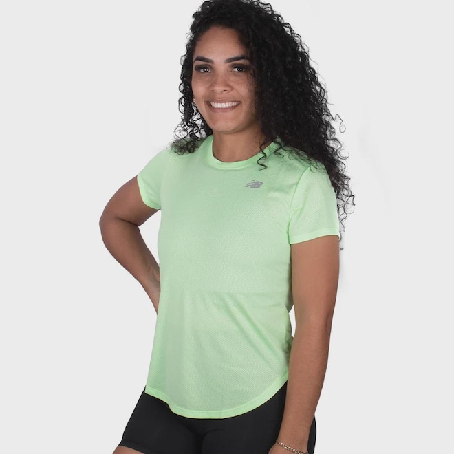 Nome: Camisa New Balance Accelerate Feminina Verde Origem: Importada. Indicado para: Treino Cor: Verde Composição: 100% Poliéster. Tecnologia: NB Dry. Peso: 95g (Referente ao tamanho M)