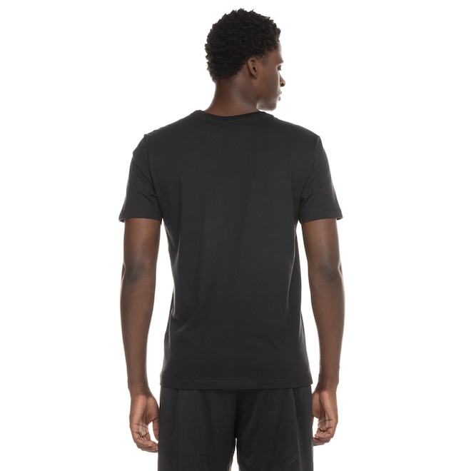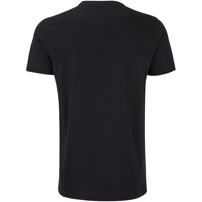 A gola da camiseta masculina é careca com tira interna em tecido que ajuda a diminuir o atrito de contato com a costura.