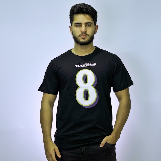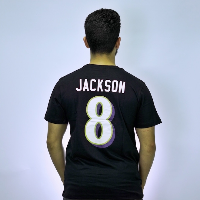 Vista a Camiseta Player Jackson e celebre o talento incomparável de Lamar Jackson. Produzida com materiais de alta qualidade, ela une conforto, resistência e autenticidade para acompanhar você em cada lance da temporada. Com sua cor predominante preta e seu número 8 estampado na camisa. Trazendo autenticidade a camisa com seu tecido leve em algodão e por sua vez suas mangas curtas.