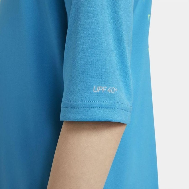 A Camiseta Nike Swim apresenta tecnologia que absorve o suor e proteção solar.