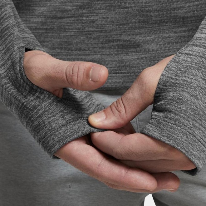 - Orifícios para o polegar nas mangas proporcionam aquecimento extra para as suas mãos e um ajuste seguro em movimento.