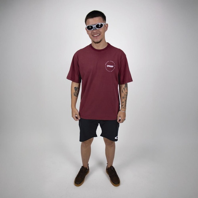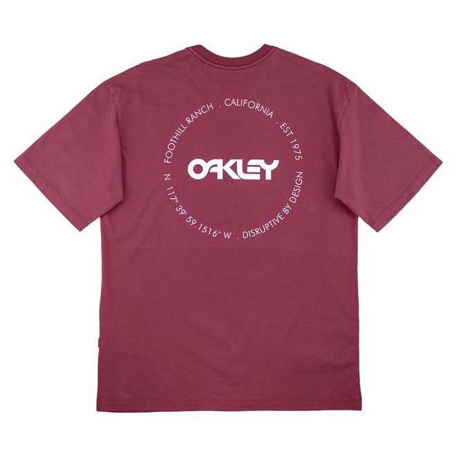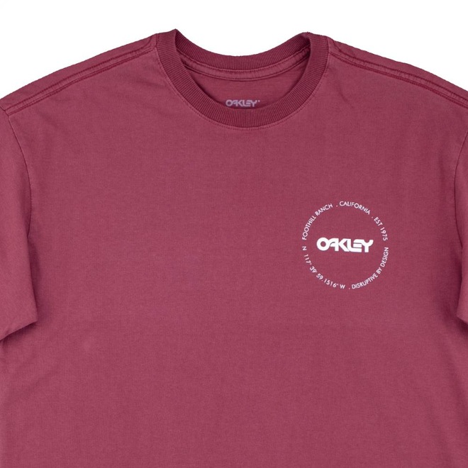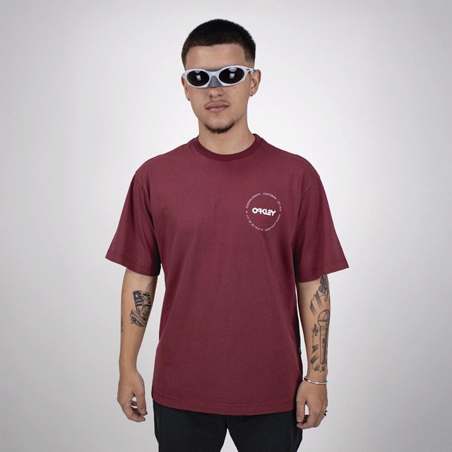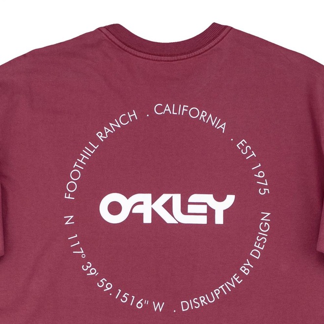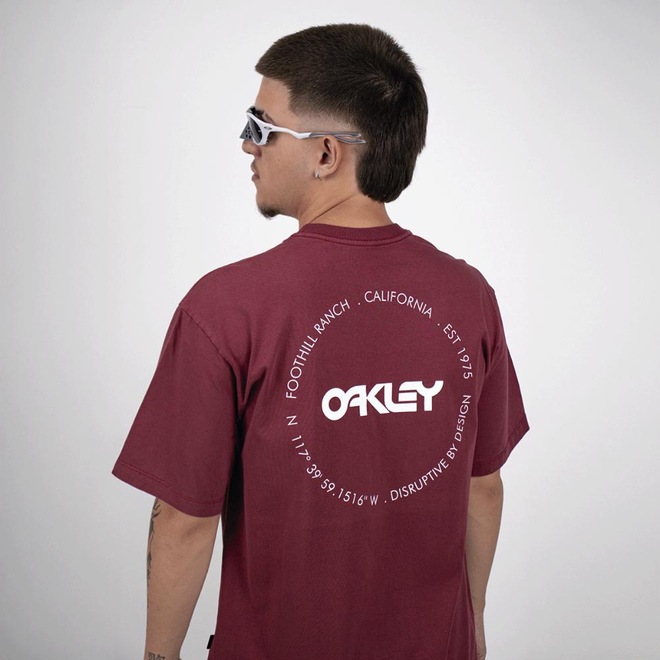 O destaque fica por conta da estampa circular B1B, com o logo Oakley centralizado e coordenadas que remetem à sede da marca em Foothill Ranch, Califórnia um tributo às origens da Oakley e ao conceito Disruptive by Design. Uma peça que traduz a herança esportiva e o espírito inovador da marca em cada detalhe.