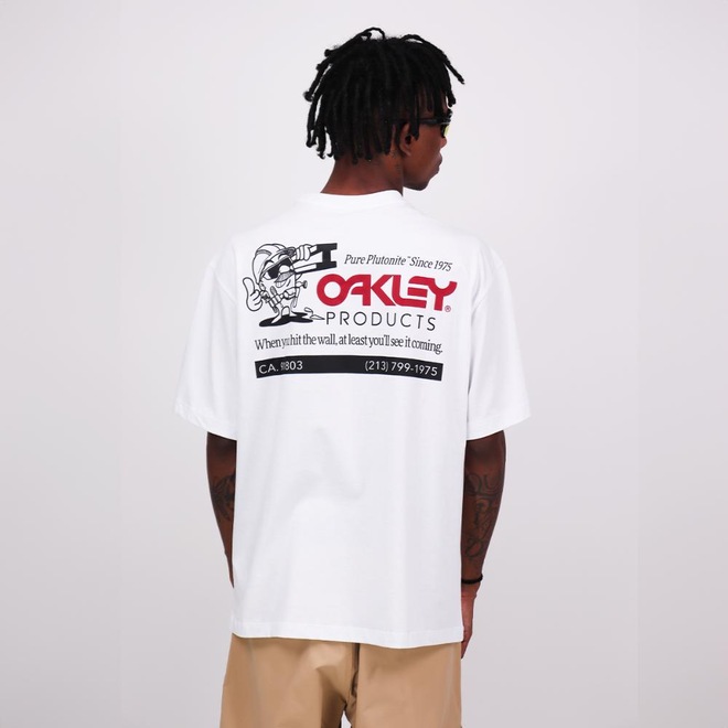 O grande destaque da peça está na estampa traseira, um design clássico que celebra a história da Oakley. A arte traz o icônico personagem com binóculo, acompanhada do logo Oakley B1B e da frase When you hit the wall, at least youll see it coming. Essa frase faz referência direta ao Plutonite, material exclusivo das lentes Oakley, que garante proteção e nitidez superiores. Além disso, a estampa exibe o número de telefone original da marca e seu primeiro código postal, marcando o início da trajetória da Oakley em 1975.