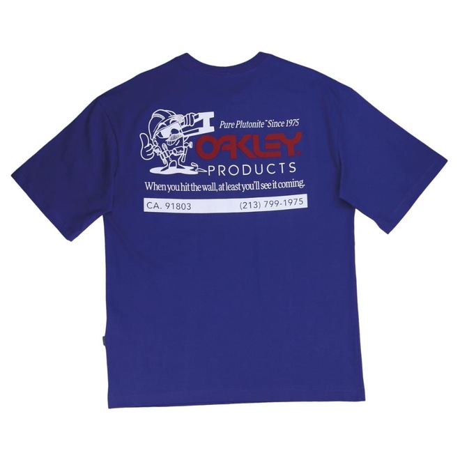 O grande destaque da peça está na estampa traseira, um design clássico que celebra a história da Oakley. A arte traz o icônico personagem com binóculo, acompanhada do logo Oakley B1B e da frase When you hit the wall, at least youll see it coming. Essa frase faz referência direta ao Plutonite, material exclusivo das lentes Oakley, que garante proteção e nitidez superiores. Além disso, a estampa exibe o número de telefone original da marca e seu primeiro código postal, marcando o início da trajetória da Oakley em 1975.