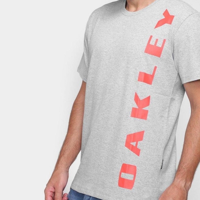 Camiseta Oakley com logo em silk base dágua aplicado na vertical no lado esquerdo.