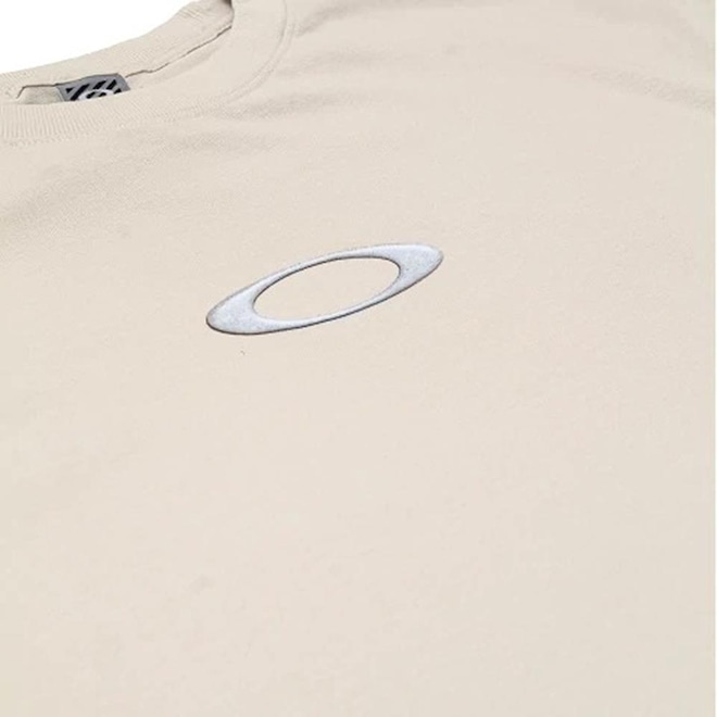 O grande destaque visual fica por conta do logo Oakley Ellipse na parte frontal. O símbolo é aplicado em silk com efeito de relevo (puff), o que simula uma textura metálica e adiciona um toque sofisticado e tridimensional ao design minimalista da peça.
