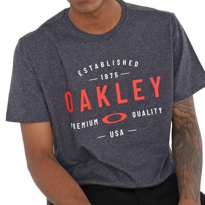 Camiseta Oakley com logo em silk plastisol e etiqueta na lateral esquerda.