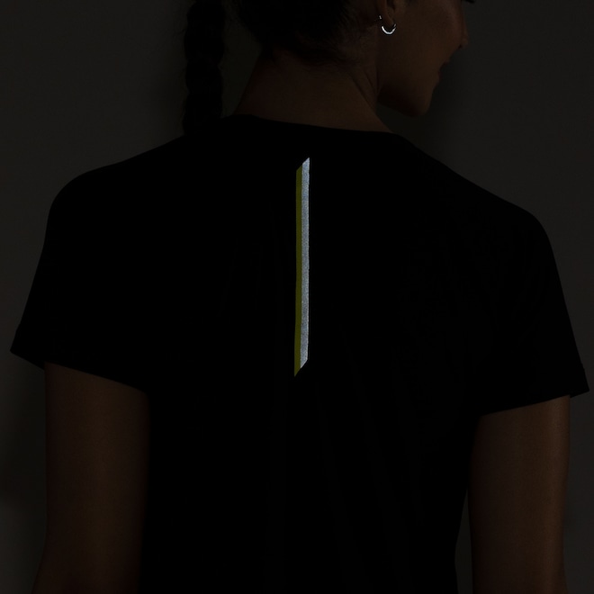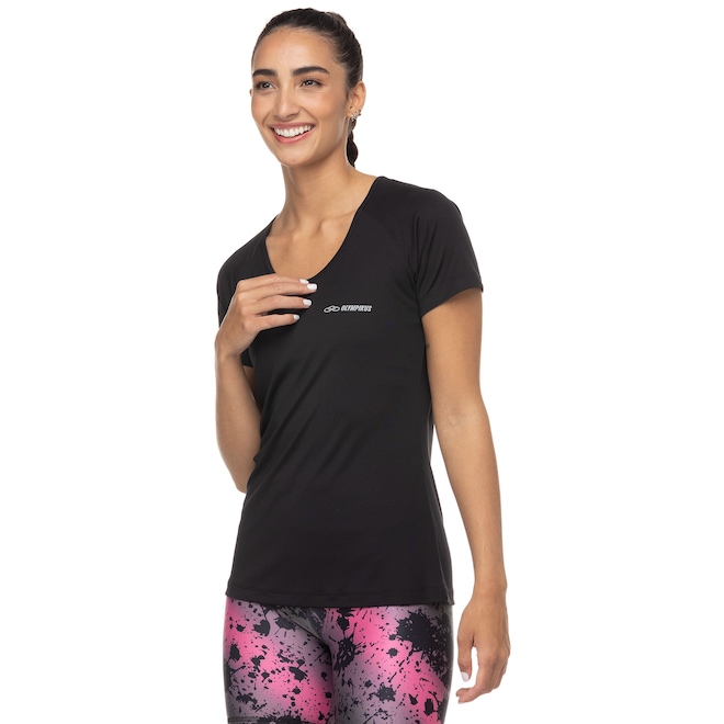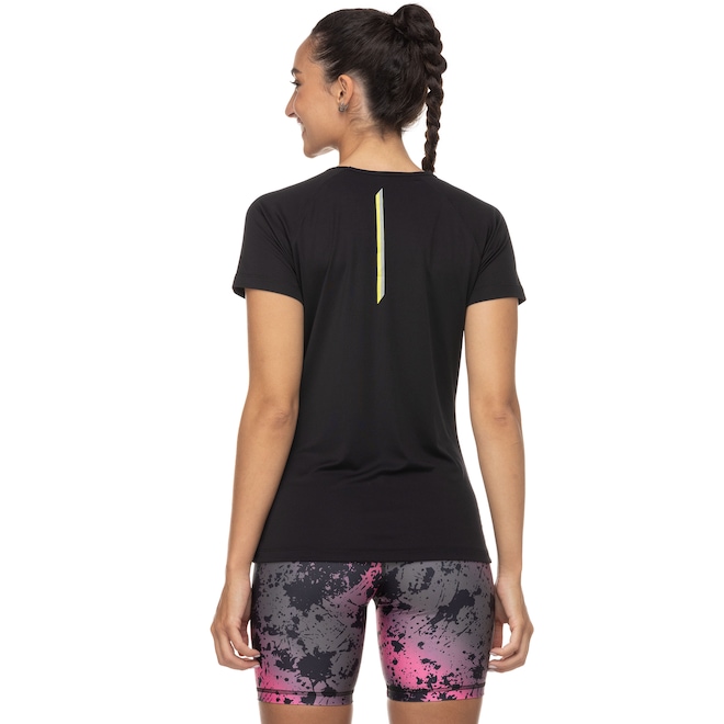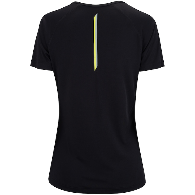A camiseta Olympikus feminina é de gola careca, com detalhes refletivos que facilitam a visualização em locais com pouca iluminação.