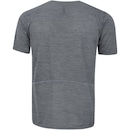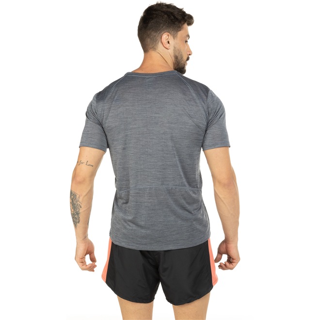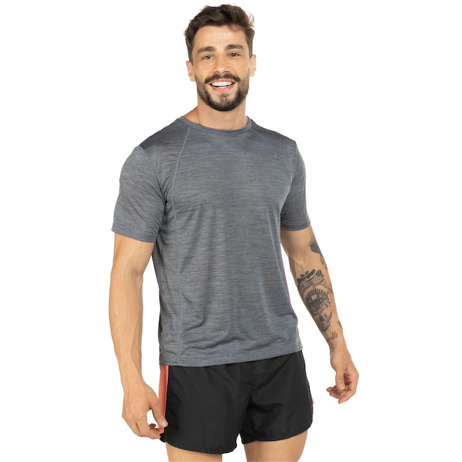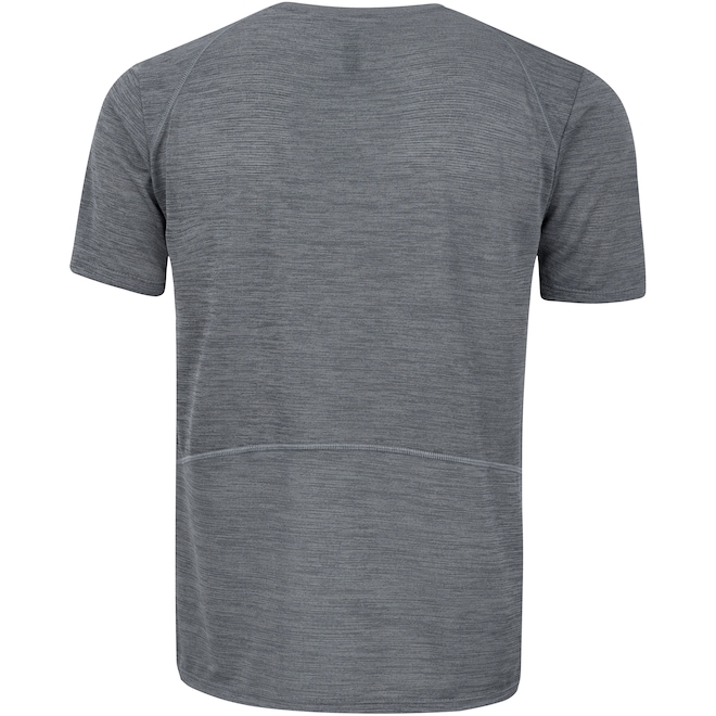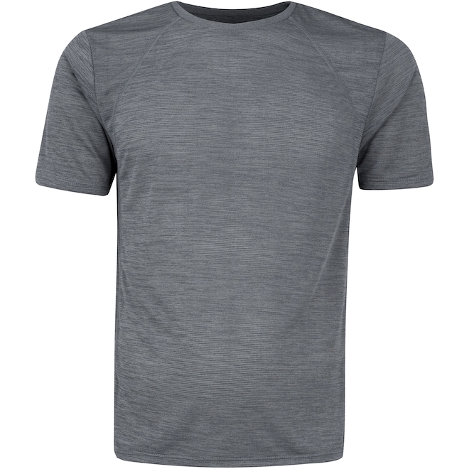 A gola da camiseta masculina é careca com tira interna em tecido que ajuda a diminuir o atrito de contato com a costura.