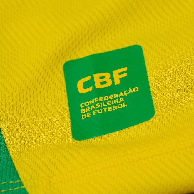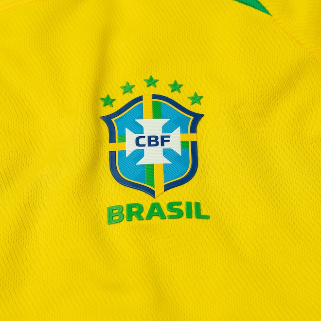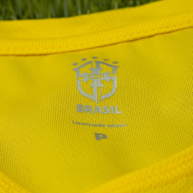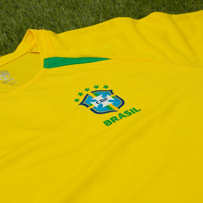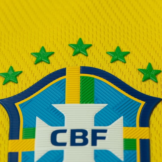 O escudo 3D e o design anatômico esportivo exalam a grandiosidade da Seleção Canarinho.
