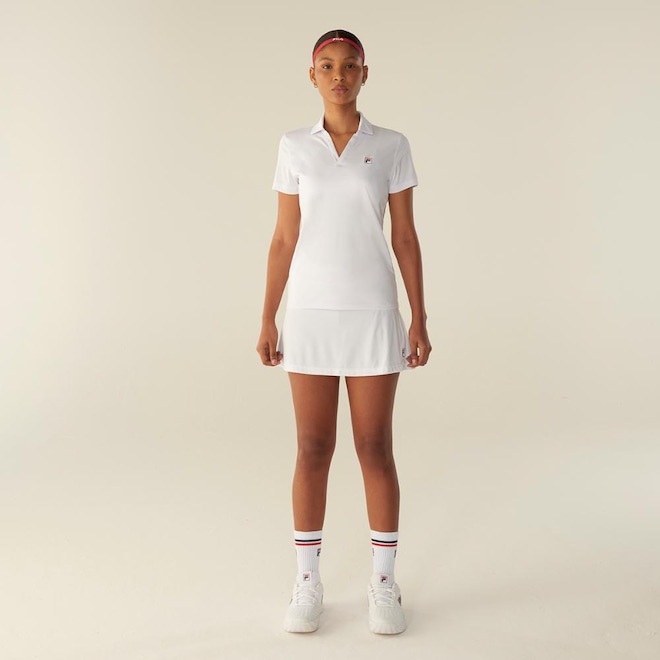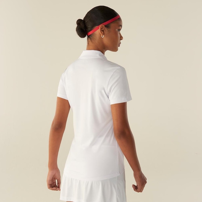 Camisa polo feminina confeccionada em malha de poliéster reciclado com elastano. Apresenta as tecnologias FLOW (mantém o corpo na temperatura ideal) e UV PROTECTION (proteção solar FPS 50+). A peça possui decote V e barra traseira arredondada com comprimento maior que a frontal. A assinatura da marca é aplicada na parte frontal com o patch F-box.