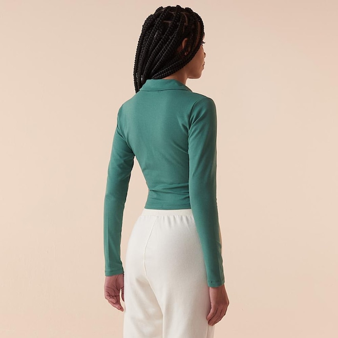 Modelagem Moderna: A modelagem cropped e a gola polo clássica criam um contraste estiloso e super atual.