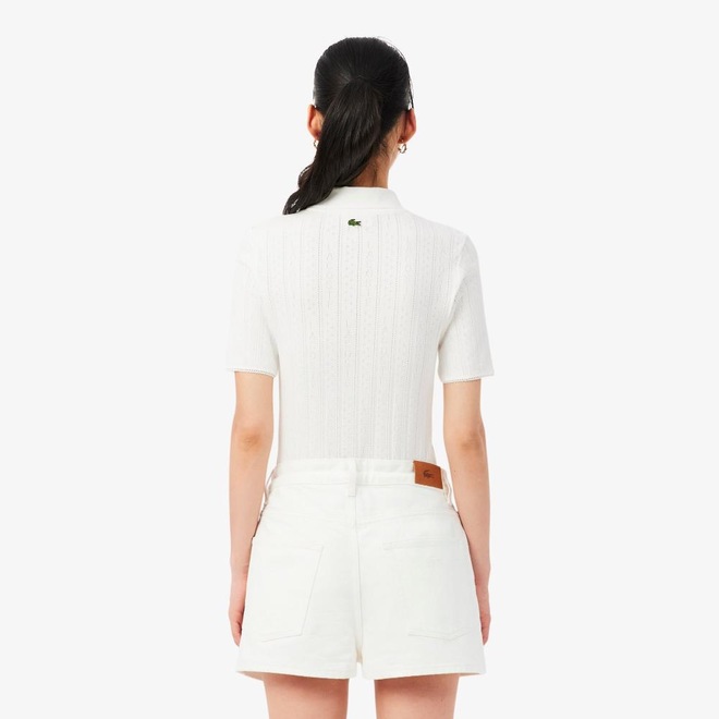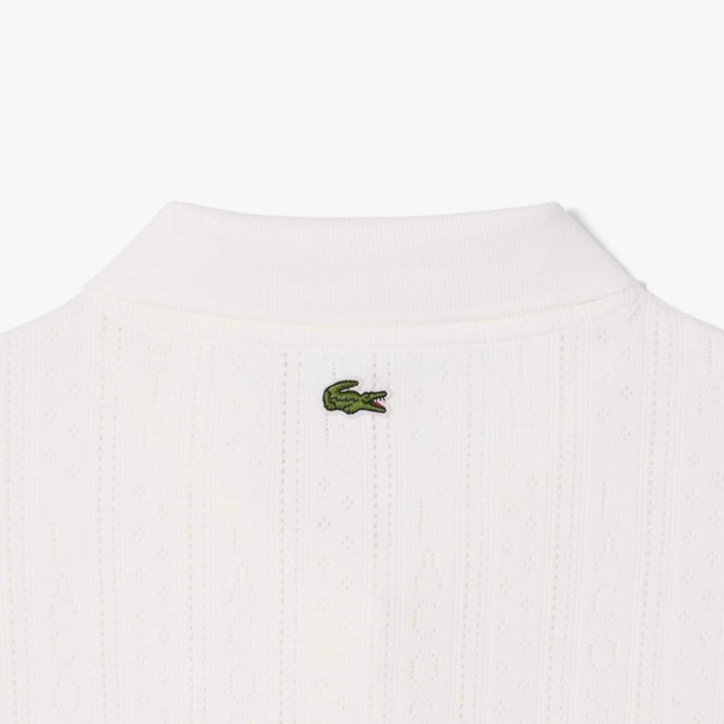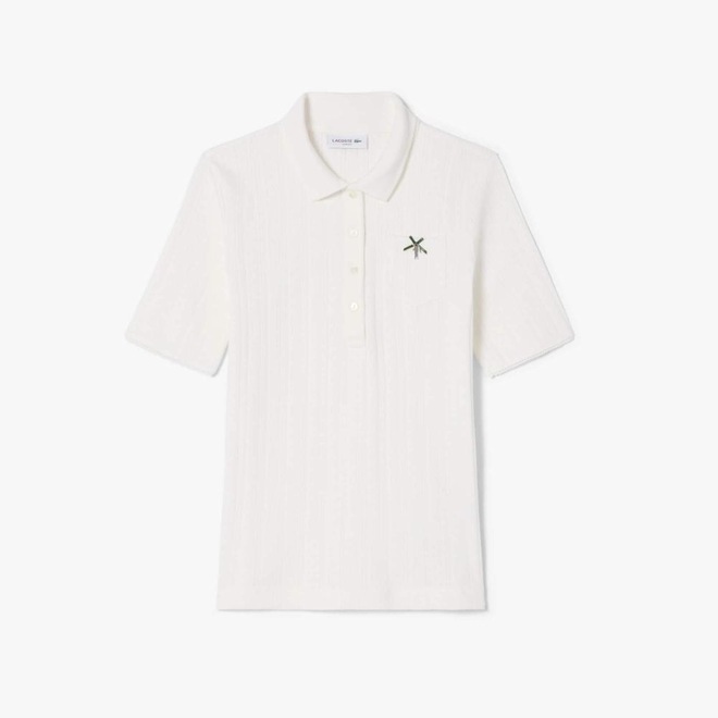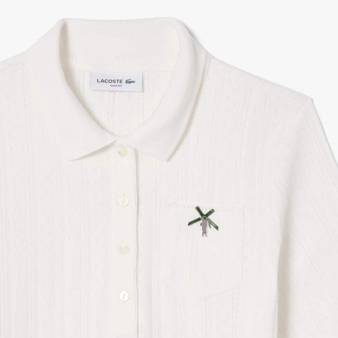 Essa polo é fruto de 90 anos de elegância e expertise da Lacoste. Feita com tecido de malha Pointelle delicado, sutil, com textura fina, com detalhes de marca rendados em toda a peça. Uma peça sofisticada, feminina, com detalhes únicos, incluindo um bolso no peito com acabamento de fita e um crocodilo de metal.