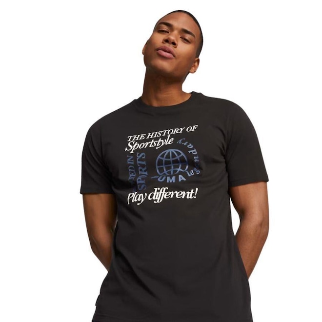 A PUMA sempre foi diferente, e esta camiseta celebra isso com sua estampa ?Play Different?. Destaque-se e seja diferente com esta camiseta masculina de modelagem regular, com estampa na frente e nas costas. O algodão usado nos produtos PUMA vem de fazendas com foco na agricultura sustentável, como eficiência hídrica e proteção da saúde do solo. Detalhes: modelagem regular, estampa gráfica na frente e tecido simples.