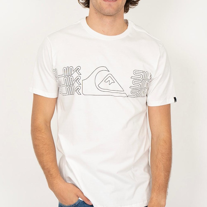 Camiseta QuikSilver feita em modelagem regular fit, meia malha penteada, estampa full tórax aplicada na frente e etiqueta da marca aplicada na manga do lado esquerdo de quem veste.