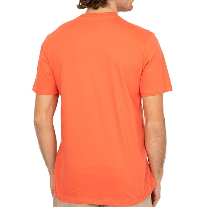 Camiseta QuikSilver feita em modelagem regular, meia malha, estampa aplicada na frente e etiqueta da marca aplicada próximo a barra do lado esquerdo de quem veste.