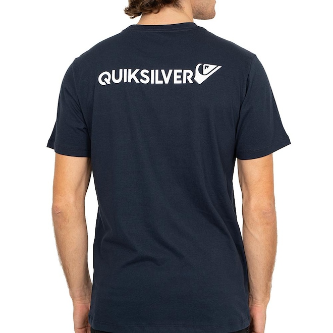 Camiseta QuikSilver feita em modelagem regular, meia malha, patch bordado aplicado na frente e estampa nas costas, estampa-etiqueta aplicada na barra e etiqueta da marca aplicada na manga do lado esquerdo de quem veste.
