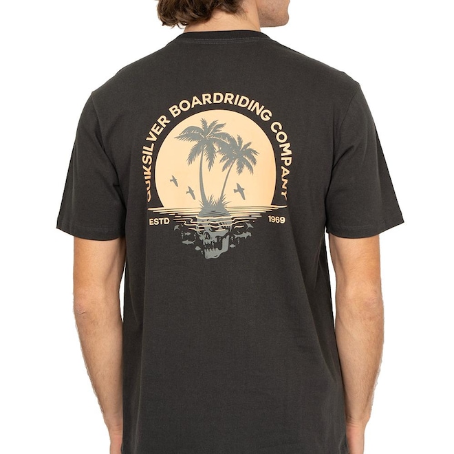 Camiseta QuikSilver feita em modelagem regular, meia malha, estampa aplicada na frente e centro costas e etiqueta da marca aplicada na manga do lado esquerdo de quem veste.