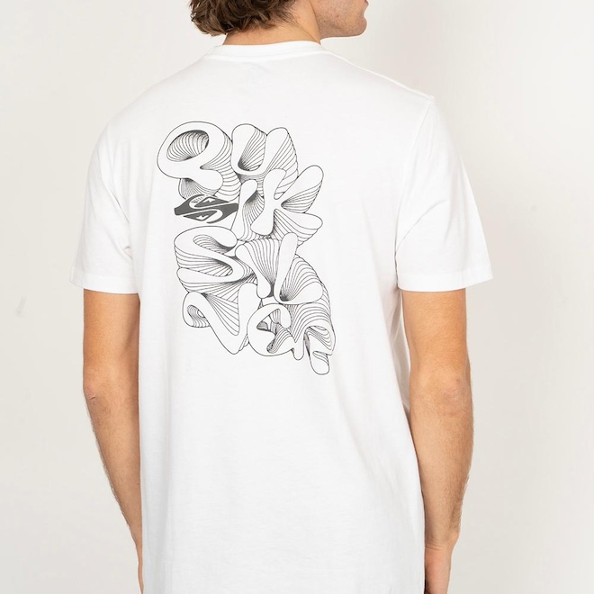 Camiseta QuikSilver feita em modelagem regular fit, meia malha, estampa aplicada na frente e etiqueta da marca aplicada na manga do lado esquerdo de quem veste.