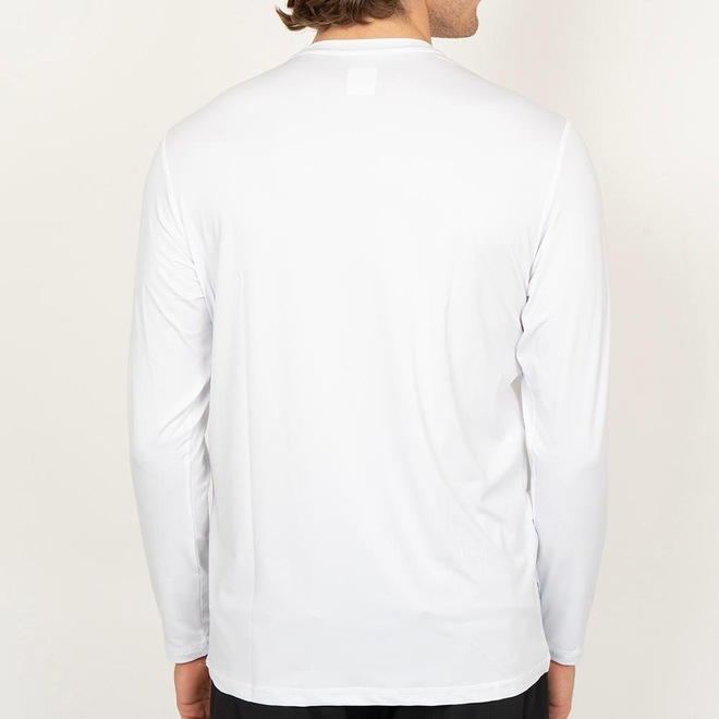 Camiseta QuikSilver Surf ML feita em tecido UV DRY com tecnologia anti-microbiana, secagem rápida e proteção UV50+, estampa centralizada na frente e etiqueta personalizada na lateral de quem veste.