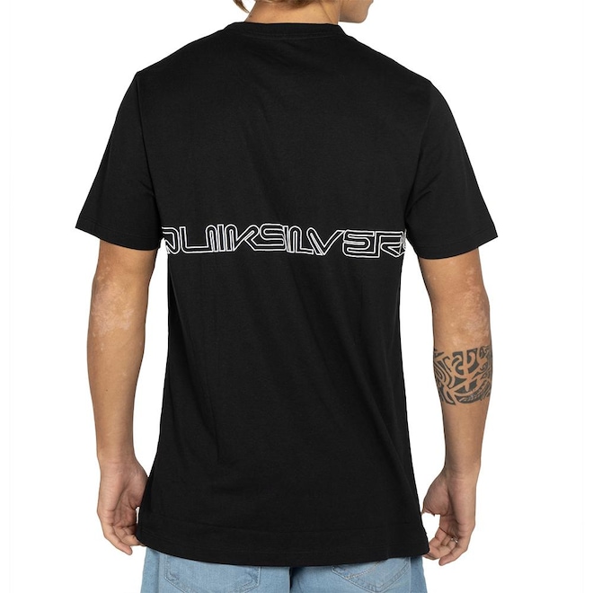 Camiseta QuikSilver feita em modelagem regular fit, meia malha penteada, possui estampa na largura total do tórax na frente e nas costas e etiqueta da marca na manga esquerda.