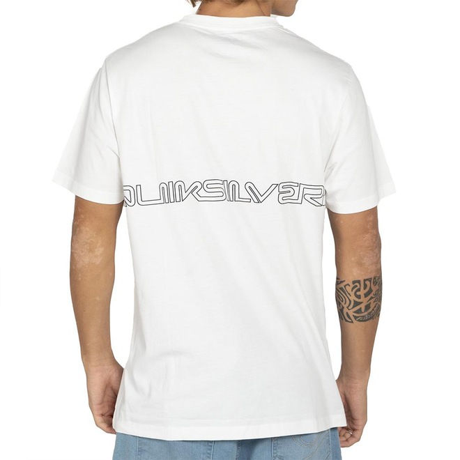 Camiseta QuikSilver feita em modelagem regular fit, meia malha penteada, possui estampa na largura total do tórax na frente e nas costas e etiqueta da marca na manga esquerda.
