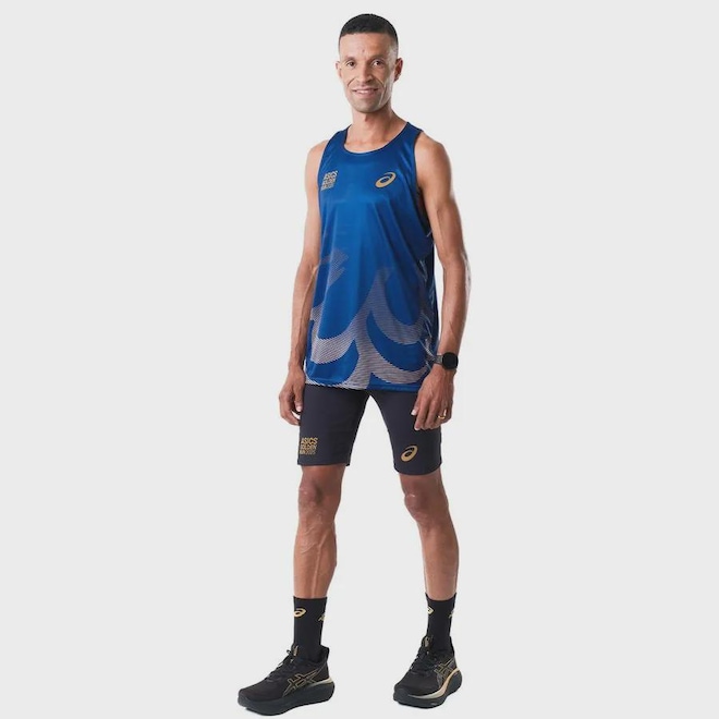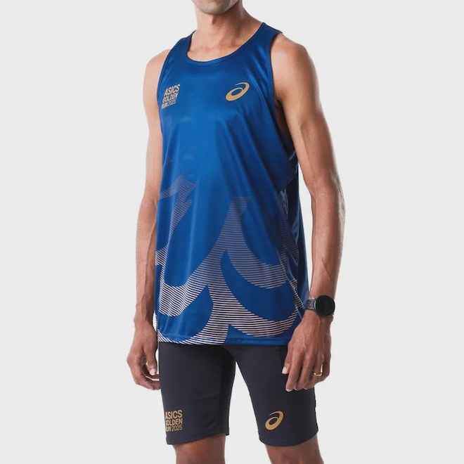 A REGATA ASICS GOLDEN RUN em tecido 100% poliéster, com toque super agradável, leve, respirável e com secagem rápida. Esta regata apresenta aplicações como logo ASICS GOLDEN RUN e espiral ASICS, e possui recorte nadador, com modelagem feita para não prender os movimentos. Remete as cores do maior circuito de meia maratona da América Latina com a sua cor azul escura, contém um design que inspira movimento com detalhes em dourado. Uma peça de alta qualidade para prática esportiva, com respirabilidade avançada. Secagem rápida Leve Tecido de malha confortável--