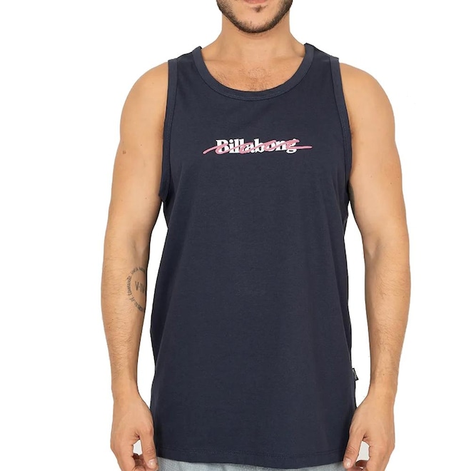 Regata Billabong feita em modelagem Regular fit, meia malha penteada de algodão fio 30.1, estampa aplicada na frente e etiqueta da marca aplicada na lateral esquerdo de quem veste.