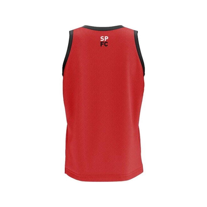 Regata com gola V combinada com as cavas. Além disso, a peça leva estampa de toque zero com estádio Morumbi e elementos de engranagens remetendoa máquina de títulos. Tecido: Dry Max