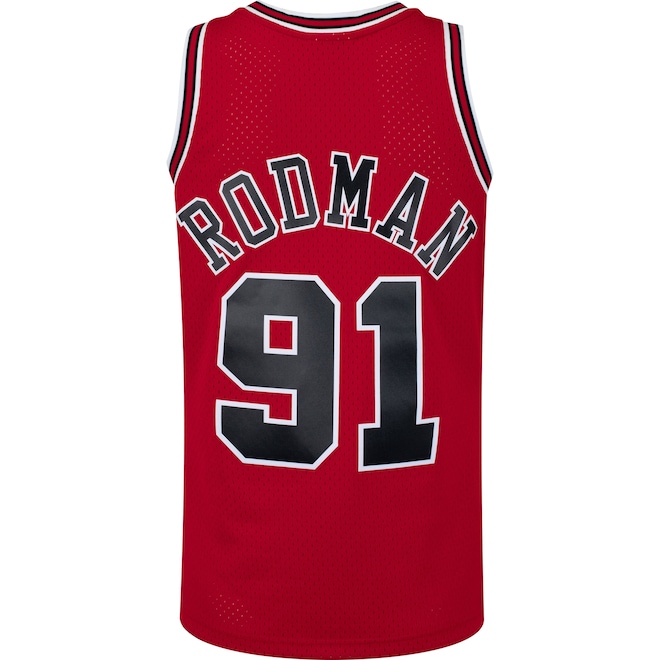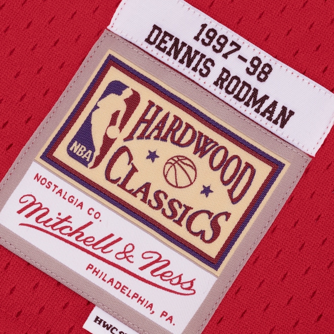 E para complementar, em destaque o escudo Chicago Bulls e patch em tecido que tem como inspiração o jogador Dennis Rodman, camisa usada por ele durante a temporada.
