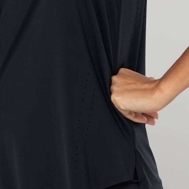 A gola careca proporciona um visual moderno, enquanto o corte arredondado na parte de trás adiciona um toque de conforto.