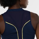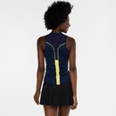 Sua gola é careca com ajuste frontal por zíper, a modelagem é de barra traseira com recorte arredondado.