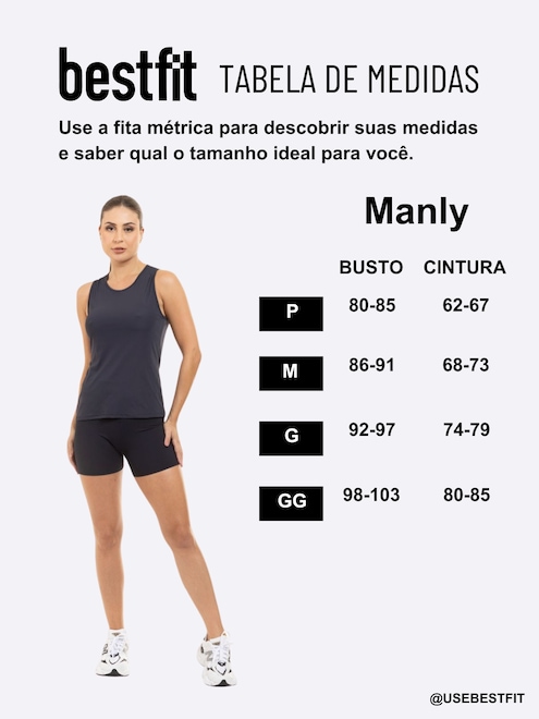 A Blusa Regata Manly Básica Feminina é a escolha ideal para quem busca liberdade, conforto e um visual clean durante os treinos ou no dia a dia. Com alças largas, corte solto e tecido leve que respira com você, ela garante máxima mobilidade sem abrir mão do estilo. A tag metálica nas costas adiciona um toque sofisticado ao design minimalista. Garanta já a sua e experimente o essencial que faz a diferença! Especificações: Alça larga. Corte solto. Material leve e respirável. Tag metálica nas costas. Benefícios: Alças largas que oferecem mais firmeza e segurança durante os movimentos. Corte solto que proporciona liberdade total e conforto prolongado. Tecido leve e respirável, ideal para treinos intensos ou dias quentes. Detalhe metálico que eleva o visual básico com sofisticação. Peça versátil para academia, caminhada ou composições casuais. Composição: 100% Poliamida. Cuidados e Conservação: Lavar à mão ou na máquina em ciclo delicado. Evitar alvejantes e produtos abrasivos. Secar à sombra, sem torcer. Não passar ferro diretamente sobre o detalhe metálico. Evitar superfícies ásperas para preservar o tecido.