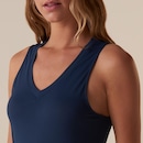 Camiseta Regata feminina confeccionada em malha de poliamida com tecnologia FLOW, que propicia mais respirabilidade e conforto térmico. A modelagem regular, com decote V e barra arredondada, proporciona um perfeito caimento. Possui cava profunda que garante liberdade de movimento, acabamento de cobre gola no mesmo tecido e costura rebatida. Apresenta o logo FILA Linear aplicado na parte de trás da regata.