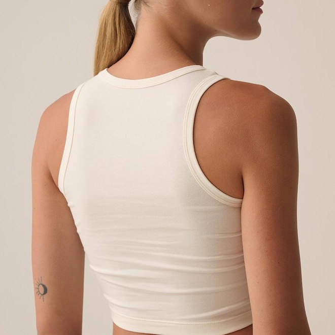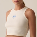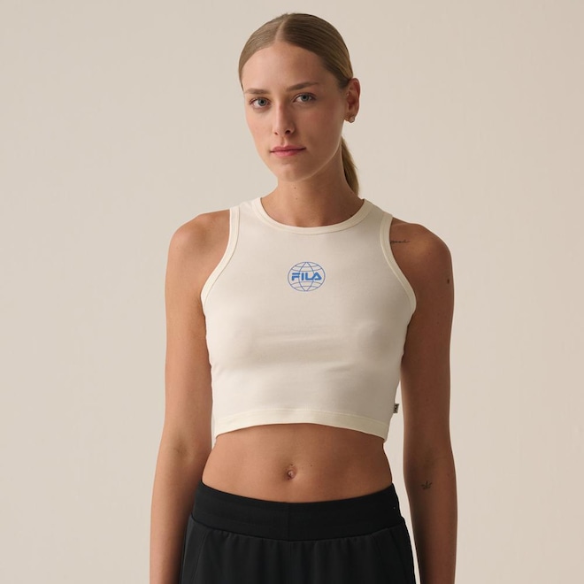 Camiseta Regata cropped feminina confeccionada em meia malha de algodão com elastano. Modelagem slim fit, ajustada ao corpo, com gola careca e cavas em viés. Produto ecológico com selo BCI (Better Cotton Initiative) e processo de lavagem com amaciante natural de arroz, elaborado para causar menos impacto ao meio ambiente, proporcionar boa capacidade de transpiração e toque macio. Possui estampa gráfica Fila World em silk centralizada na parte frontal superior e etiqueta bandeira Fila aplicada na lateral esquerda.