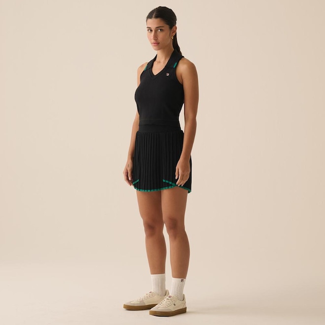 Inspirada nos clássicos da Fila, a regata tem um design sofisticado. A gola polo com listras e o decote em V canelado adicionam um toque refinado, enquanto o decote nadador nas costas garante um visual moderno e liberdade de movimento.