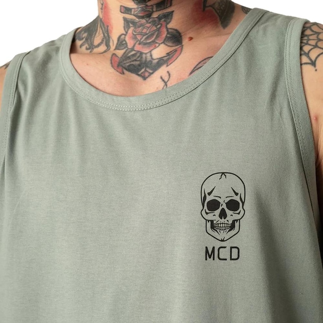 Regata Mcd feita em modelagem básica, malha penteada 30.1, estampa silk zero toque caveira localizada no peito, etiqueta bandeira embutida na lateral e tag personalizado MCD.