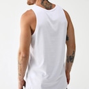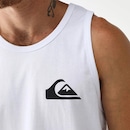 Regata Quiksilver básica com tecido em meia malha de algodão cardado, gola redonda com ribana e cavas, silk uma cor localizado no peito e etiqueta aplicada na barra.
