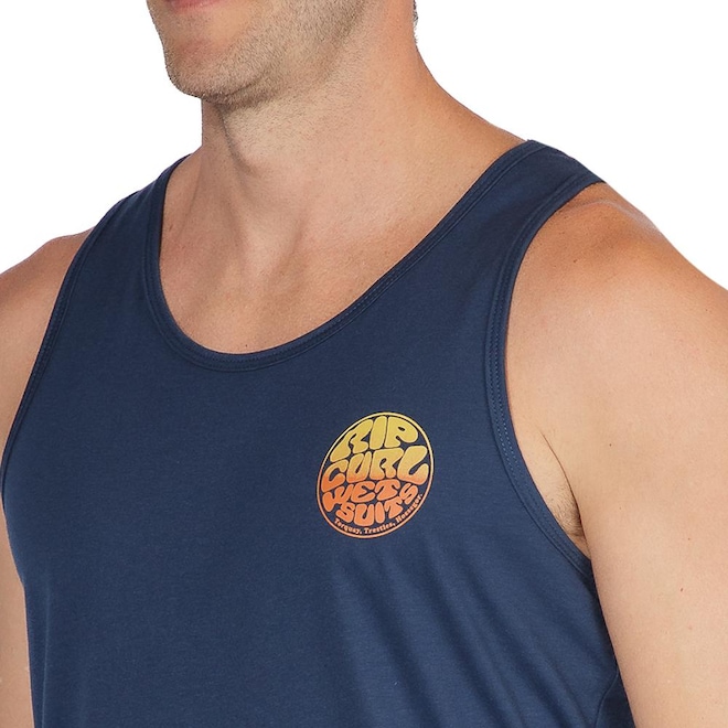 Regata Rip Curl feita em modelagem regular fit, meia malha 30.1 penteada, silk frente e costas degrade e etiquetas personalizadas.