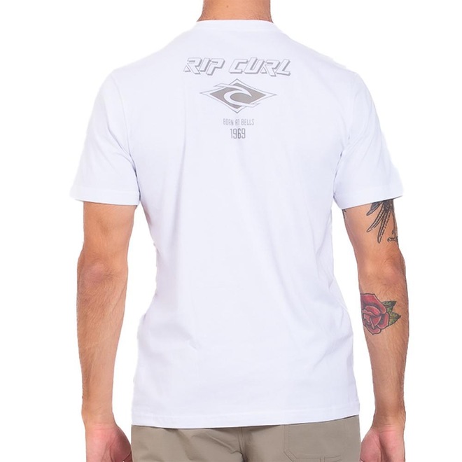 Camiseta Rip Curl feita em modelagem relaxed fit, meia malha 26.1 penteada, estampa localizada na frente e costas e etiquetas personalizadas.