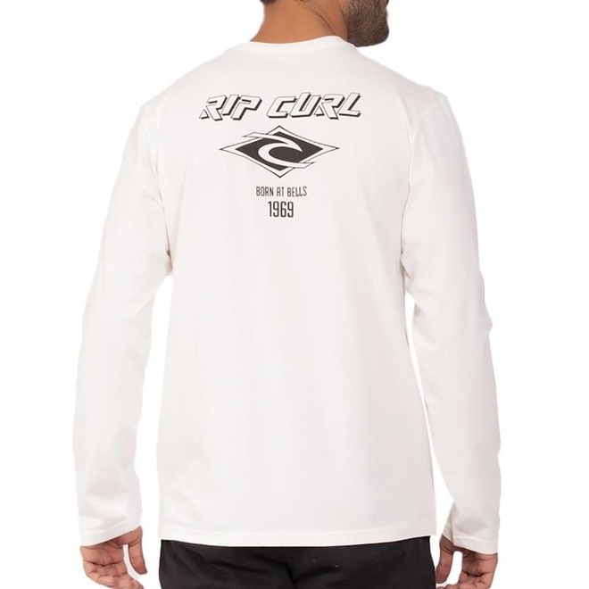 Camiseta Rip Curl meia malha 30.1 penteada, estampa localizada, manga longa regular fit e etiquetas personalizadas.