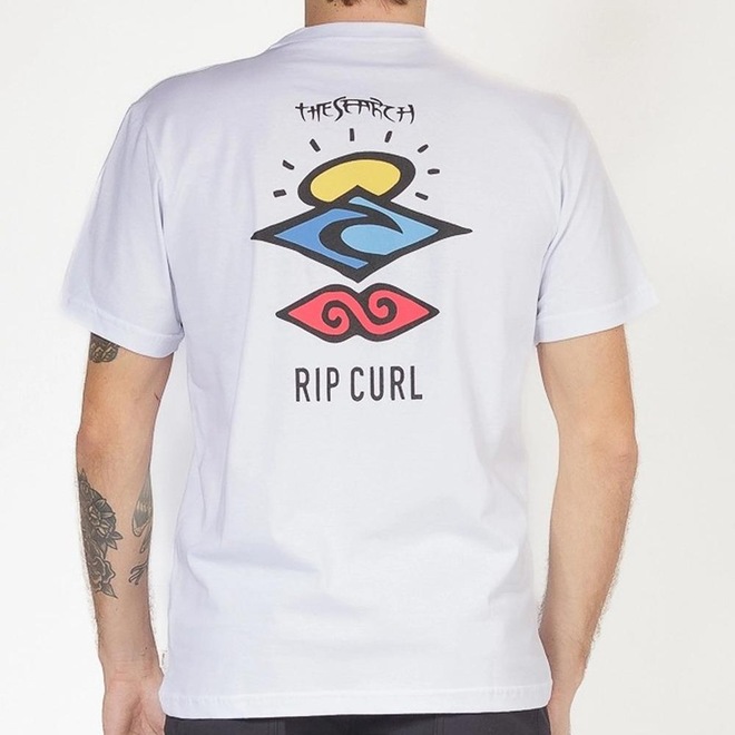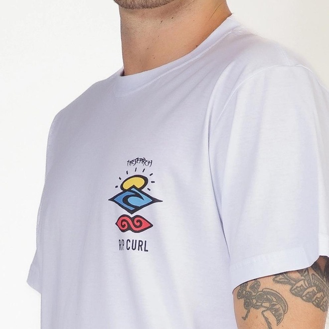 Camiseta Rip Curl feita em modelagem relaxed fit, meia malha 26.1, silk frente e costas e etiquetas personalizadas.