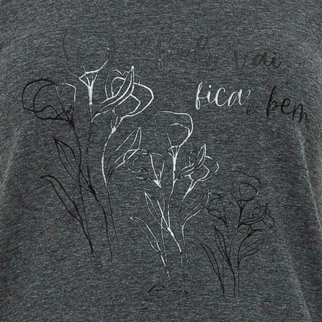 Apresenta serigrafia na frente: "Tudo vai ficar bem". Tecido de viscose e elastano com amaciamento ecológico que utiliza o óleo extraído da casca de arroz. Possui ótimo caimento, é agradável ao toque e resistente ao pilling. Peça versátil para uso no dia a dia e lazer.