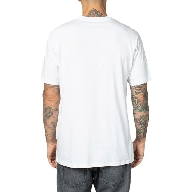 Camiseta RVCA básica em meia malha 30/1 cardada, estampa frontal, modelagem regular e etiquetas personalizadas.