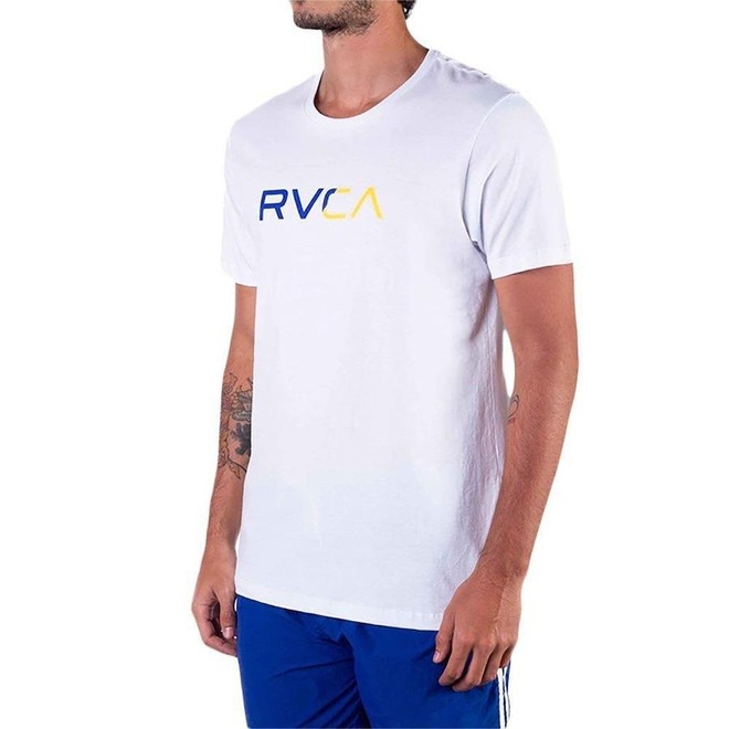 Camiseta RVCA meia malha 30.1 de algodão, modelagem regular, logo RVCA estampado na parte frontal e traseira e etiquetas personalizadas.